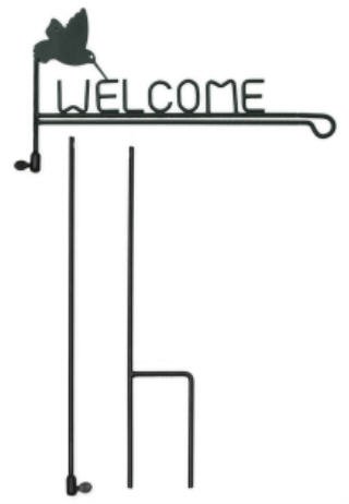 Nothing adds a new dash of color to your outdoor décor than a garden flag, and with this handy and handsome hummingbird garden flag stand, you can rotate flags as often as the season, occasion or just your mood dictates. Congratulate someone, announce a birthday, celebrate the coming of Spring, you can do it all with this easily assembled stand (top only shown) that is finished off with a hovering hummingbird and a welcome for everyone. Designed specifically to hold 12-15 inch wide flags. A great gift for housewarmings! Powder coated wrought iron. 46 x 15 inches assembled