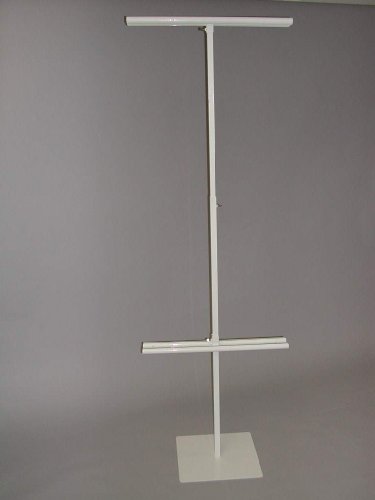 Fits banner width of 24" wide Base 14"x14" Base to lower bar: 31" Lower horizontal bar welded to upright Upper horizontal bar telescopes for adjustable height 48-92" Includes two 3/8" dowel rods to fit a 1" sewn pocket in banner ends color: white